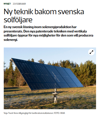 VajaTrack continues to pick up speed! Last month, Land Lantbruk, Sweden’s leading site for agriculture and forestry, spotlighted our solar tracking system as an exciting new solution in solar energy production.